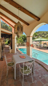 The outdoor spaces are equally impressive, with a private pool surrounded by a lush garden, a beautiful garden with vibrant flora and tranquil seating areas, and a shaded terrace perfect for alfresco dining and enjoying the Mediterranean climate.